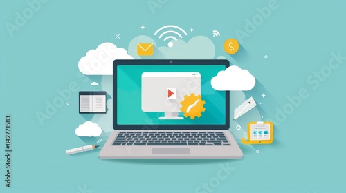 Design a graphic of a laptop with an open video conferencing application, highlighting virtual meetings and remote communication.