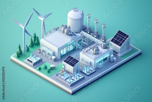 Design a research facility in an isometric 3D style, studying hydrogen energy, with wind turbines and solar panels powering the labs