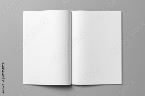Design Mockup Featuring an Open Magazine on Gray Surface, Top Perspective