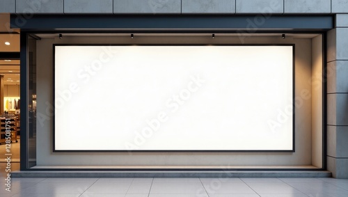 Design of an empty white horizontal indoor advertisement board displayed at the storefront window in a shopping center or mall.