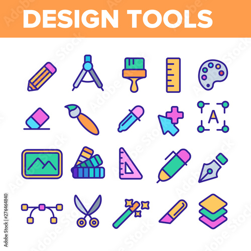 Design Tools Vector Thin Line Icons Set. Graphic Design Tools, Painting, Sketching Accessories Linear Pictograms. Drawing Equipment, Brushes, Pencils, Image Editing Instruments Contour Illustrations