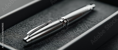 Designer pen in steel gift box with brushed finish, lined with velvet insert and subtle metallic foil branding in refined packaging style., copy space for text - high-quality