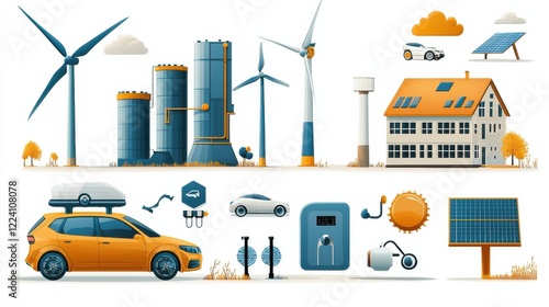 Designing clean energy icons for wind turbines and solar panels in an eco-friendly environment for enhanced ce standards