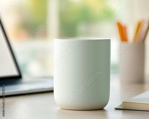 Desk setup White mug, pencils, notebook and laptop on surface near a window