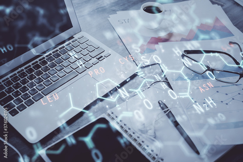 Desktop computer background and formula hologram writing. Double exposure. Education concept.