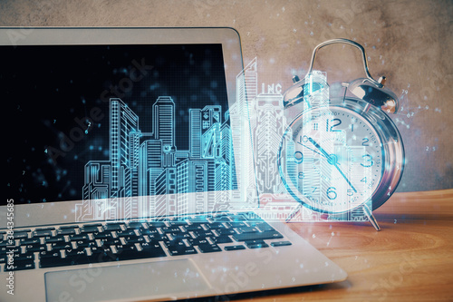 Desktop computer background in office and big town buildings hologram drawing. Double exposure. Smart city concept.