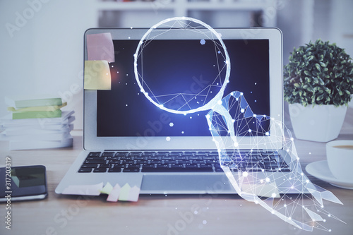 Desktop computer background in office and start up theme hologram drawing. Double exposure. Startup concept.