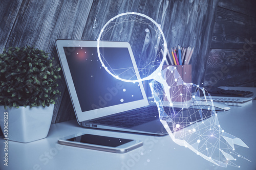 Desktop computer background in office and start up theme hologram drawing. Double exposure. Startup concept.