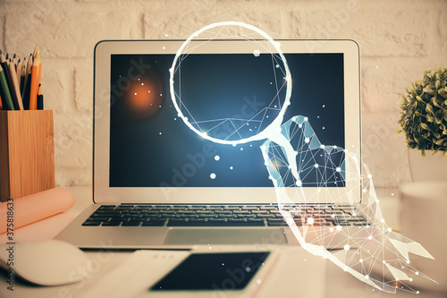 Desktop computer background in office and start up theme hologram drawing. Double exposure. Startup concept.