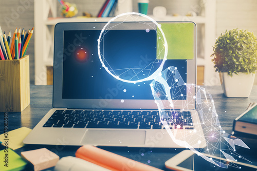 Desktop computer background in office and start up theme hologram drawing. Double exposure. Startup concept.