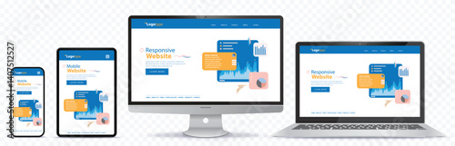 Desktop Computer, Laptop, Tablet PC and Smart Phone Screen Set With Responsive Website Design. Vector template for mobile friendly website and app screen.