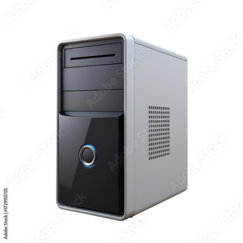 Desktop computer tower case with front panel, isolated 3D PNG icon