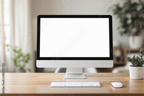 Desktop computer with blank white screen on a wooden desk, accompanied by a keyboard, mouse, and small plant, in a bright, minimalist room. Ai generative