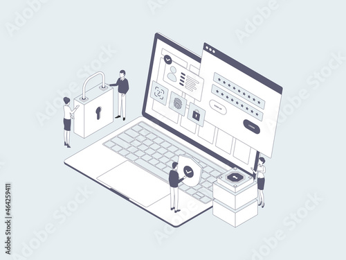 Desktop Login Isometric Illustration Lineal Grey. Suitable for Mobile App, Website, Banner, Diagrams, Infographics, and Other Graphic Assets.