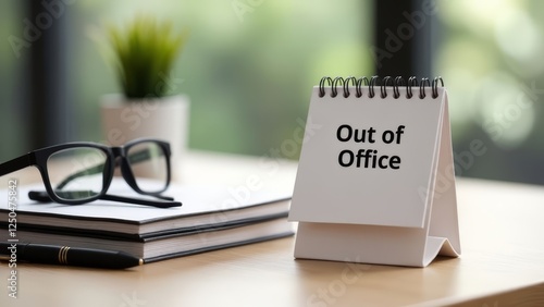 Desktop scene with 'Out of Office' message and business lifestyle accessories