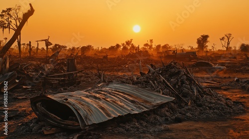 Desolate Landscape at Sunset After Wildfire with Charred Remains