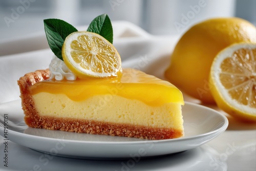 Dessert and Lemon. Delicious lemon cheesecake slice with fresh lemon garnish.
