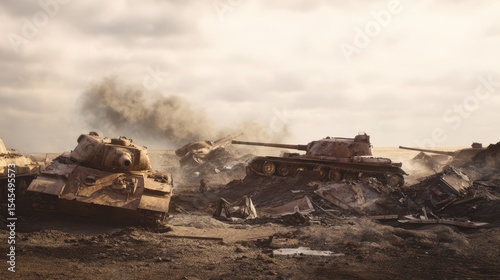 Destroyed military tanks on a smoldering battlefield littered with wreckage and debris under a cloudy sky. Post-war devastation and remnants of intense armored conflict. Destruction, defeat