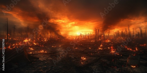 Destructive wildfires engulf forest landscape at dusk, creating a dramatic orange glow in the sky