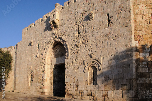 Detail of the intricate stone relief work embellishing the Zion Gate in the Old City of Jerusalem.