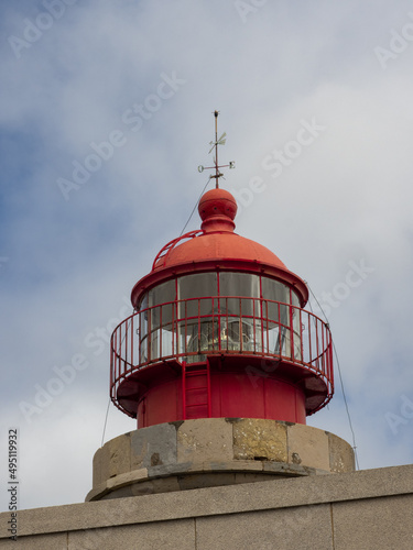 Detail of the lantern on top of the cylindrical masonry tower of the Ponta do Albernaz lighthouse. Flores Island, Portugal.