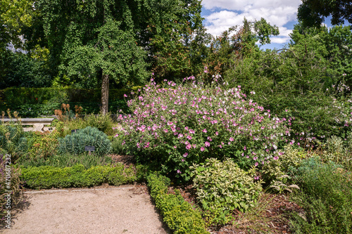 Detail of the lush green Garden in Spain, Europe. Trees, flowers, pathway and beautiful nature landscape.