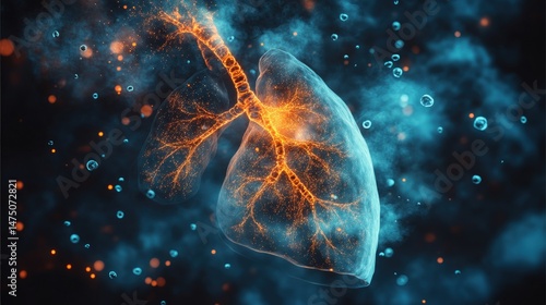 Detailed 3D illustration of a lung, highlighted with glowing, branching airways and blood vessels, against a backdrop of ethereal particles and bubbles