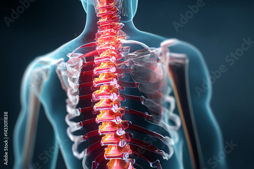 Detailed 3D rendering of human spine, showcasing vertebrae structure with red and orange highlights, possibly representing inflammation or pain, medical illustration concept