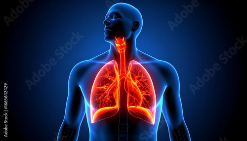 Detailed anatomical illustration of the human lungs, trachea, and related respiratory system structures, showcasing intricate vascular networks against a dark background.
