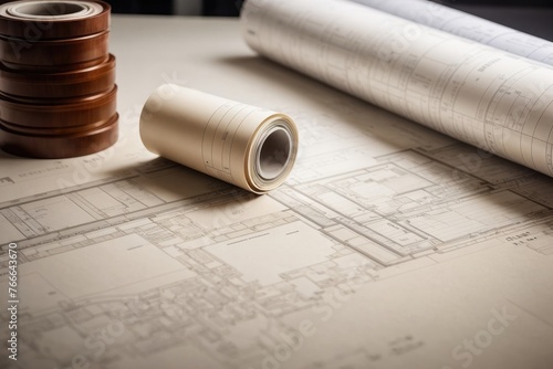 Detailed architectural blueprints and plans spread out on a designer's workspace.