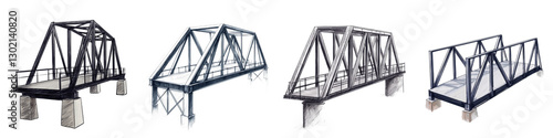 Detailed architectural wire frame showcasing the intricate designs and structures of various types of railway bridges including truss bridges suspension bridges and other industrial infrastructure