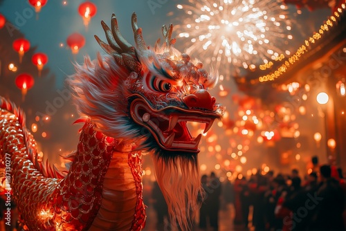 Detailed artwork of a traditional Chinese dragon in vibrant red and gold tones, symbolizing prosperity and strength during festive celebrations.