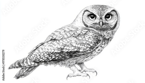 Detailed Black and White Illustration of A Majestic Owl on White Background