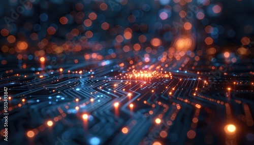 Detailed circuit board with glowing components.