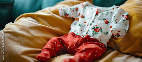 Detailed close up image of a white baby bodysuit with red pants and gnome prints set against a colored backdrop with room for additional content or text within the picture