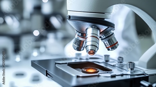 Detailed Close Up of a Microscope with Bright Lens and Laboratory Background