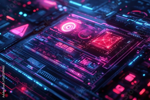 Detailed close up view of futuristic spacecraft console illuminated with blue and orange lights showing various data and warning indicators
