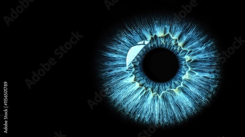 Detailed close-up of a blue human eye with intricate patterns highlighting the iris against a dark background with space for text