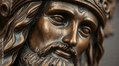 Detailed close-up of a bronze statue depicting a regal figure with a crown and intricate features