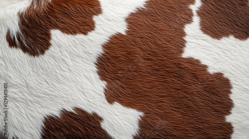 Detailed close-up of a cowhide pattern showcasing brown and white texture with large spots on a creamy background