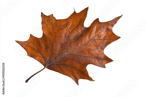 Detailed close-up of a dry autumn maple leaf showcasing vibrant orange hues against a white background