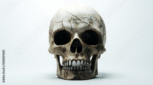 Detailed close-up of a human skull on a white background, with realistic bone texture