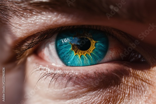 Detailed close-up of a mana??s electric turquoise eye, with vibrant iris patterns and smooth texture, captured in