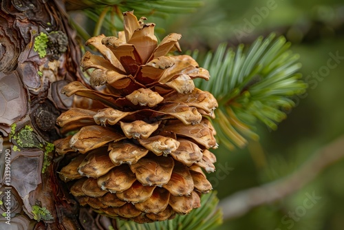 Detailed Close-up of a Mature Pine Cone on a Tree Branch. Intricate Details of its Scales and Texture. Rich Brown Hues. Delicate, Overlapping Patterns of the Cones Scales. Stunning Example of Natural