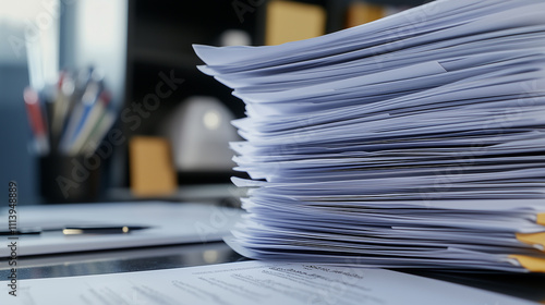 Detailed close-up of a stack of medical bills and paperwork on a desk, representing the stress of healthcare expense management, with blurred medical charts in the background.