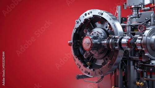 Detailed Close-Up of Advanced Mechanical Gear System with Industrial Design on a Red Background