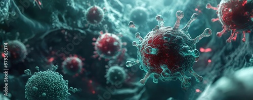 Detailed close-up of virus cells, showcasing intricate structures and vibrant colors, ideal for science and health-related content.