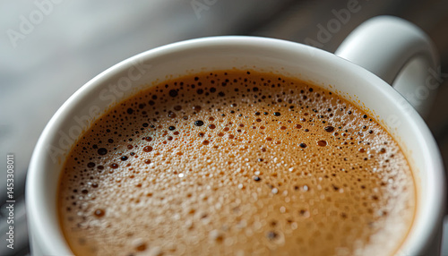 Detailed close-up view of the surface of a frothy coffee in a white mug, showcasing the texture of the foam.