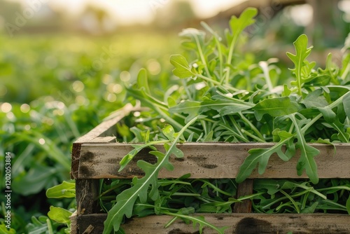 Detailed Color Image of Arugula Green Fresh in Wooden Crate, Blurred Plantation Background