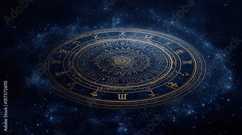 Detailed cosmic zodiac wheel surrounded by a starry night sky representing astrological signs and celestial bodies